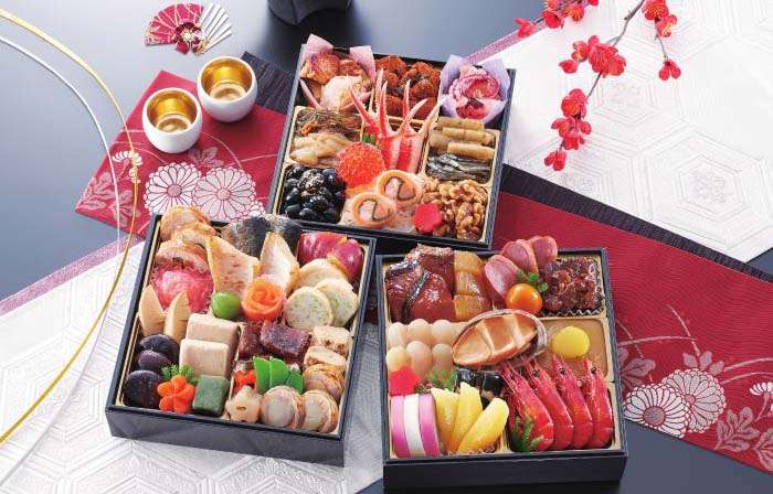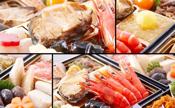 田作/黒豆 金箔/紅白膾/海老サーモン求肥巴巻/胡桃飴煮/梅花羊羹