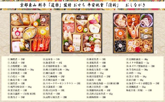 鰤照煮/大根煮/合鴨燻製/牛肉牛蒡時雨煮/金柑蜜煮/白花豆/梅花羊羹/鮑旨煮/鳴門金時金団/