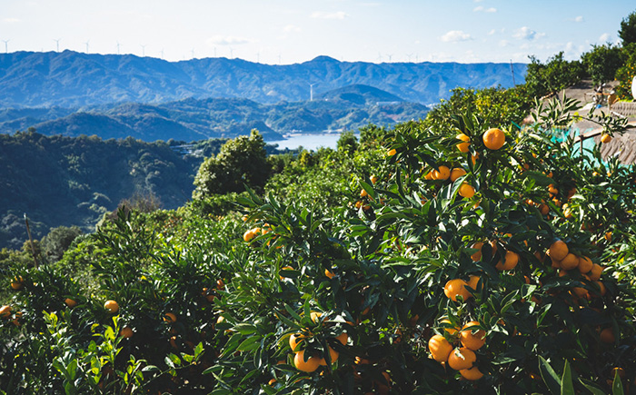 温暖な気候と湯浅湾から届く潮風。年間降雨量が少なくみかん栽培に適したこの湯浅の地で、代々みかん農家を営んできた主井農園。その年の気候に合わせて水やりの調整や、みかん栽培における重要な過程である、春芽をたくさん咲かせるための剪定作業や摘蕾作業を念入りに行いながら美味しいみかんを育てています。