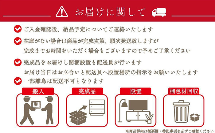 また大型家具便となります。通常の宅急便とは違いますので、発送からお届けまで1〜2週間程かかる場合もございます。