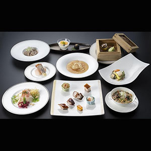 ・産地直送旬の鮮魚の香港式カルパッチョ・焼き物入り前菜盛り合わせ・フカヒレの煮込み醤油ソース・窯焼き北京ダック・活蝦夷鮑と帆立貝、黄ニラのあっさり炒め・黒毛和牛サーロイン肉の湯引き香港スタイル・水綾閣特製胡桃の担々麺・とろける杏仁豆腐
