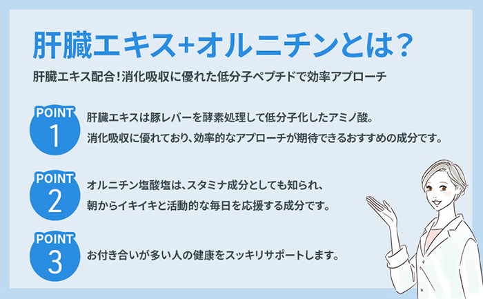 『肝臓エキス+オルニチン』は、飲む方の健康を応援するサプリメント。