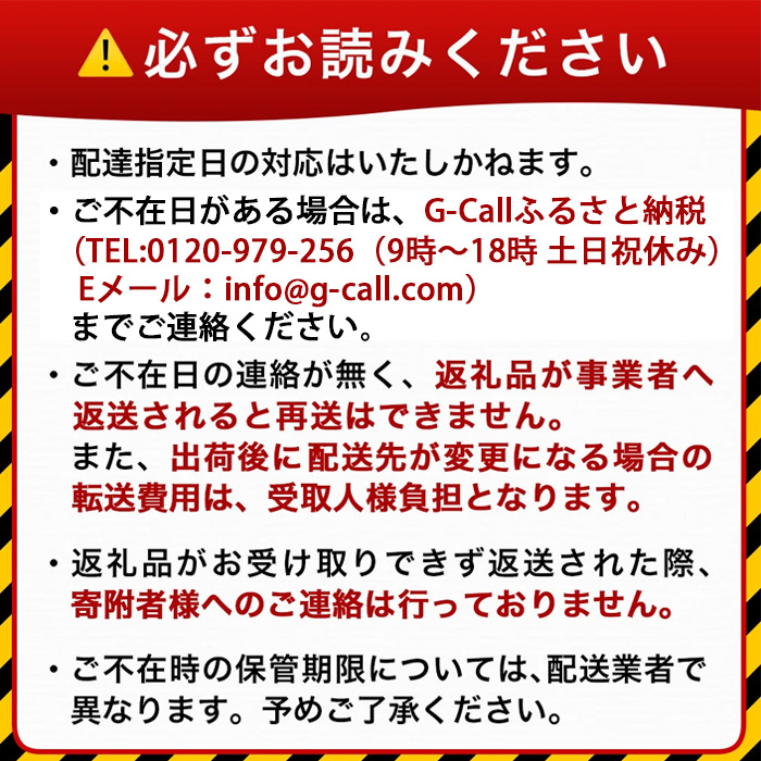 ・ご不在日がある場合は、G-Callふるさと納税(TEL:0120-979-256(9時〜18時 土日祝休み) Eメール:info@g-call.com)までご連絡ください。