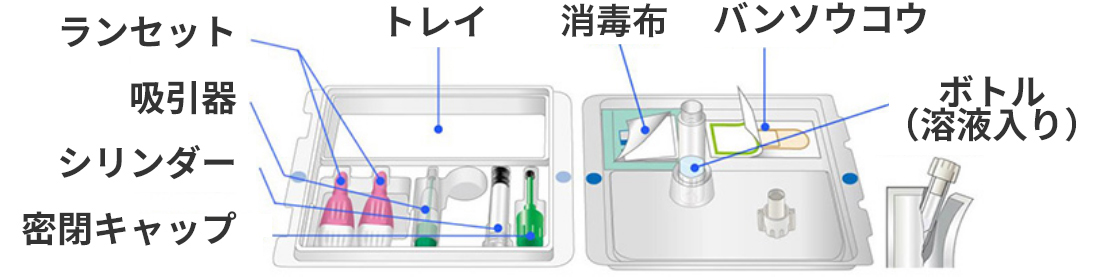 このキットにはメジャーが付いており、問診項目の中の腹囲の測定値と血圧の測定値を記入すると、 血液検査の結果とあわせて、メタボリックシンドロームか否かを判定します。