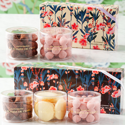 パティスリーラ・マーレ・ド・チャヤがバレンタイン・ホワイトデー限定でセレクトした「マシュマロショコラ(ココア)」、人気のクッキー「オスティ」と「ヘーゼルナッツショコラストロベリー」の詰合せです。
