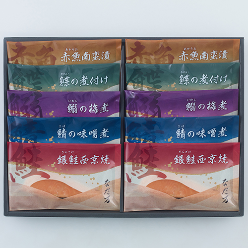 内容量:鰈の煮付け60g、銀鮭西京焼60g、鯖の味噌煮60g、赤魚南蛮漬150g(3切入)、鰯の梅煮70g(2尾入)