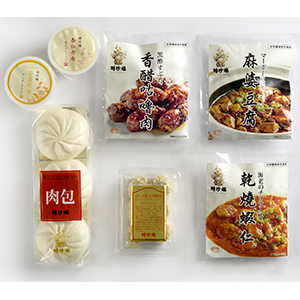 内容量:肉まん60g×3、干し貝柱入り焼売15g×6、黒酢すぶた150g、麻婆豆腐150g、海老のチリソース150g、マンゴープリン110g、杏仁プリン110g、麻辣油5g×3