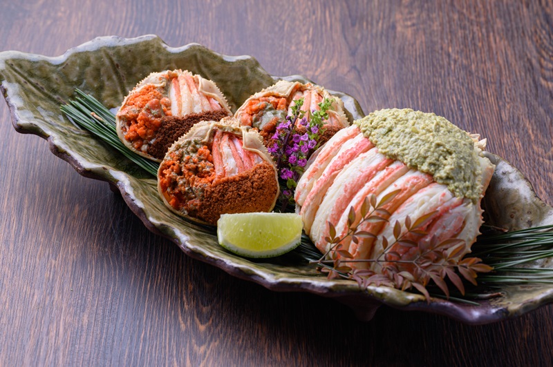 雄の繊細な蟹身、濃厚な蟹味噌と雌の内子、外子。ズワイガニの全ての味をこのセットで同時に楽しむことができます。