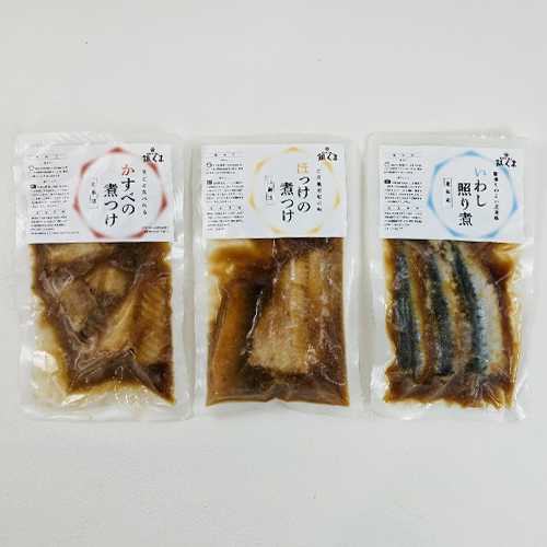 内容量:かすべ煮つけ180g×1、ほっけ煮つけ2切れ×1、いわしの照り煮3切れ×1