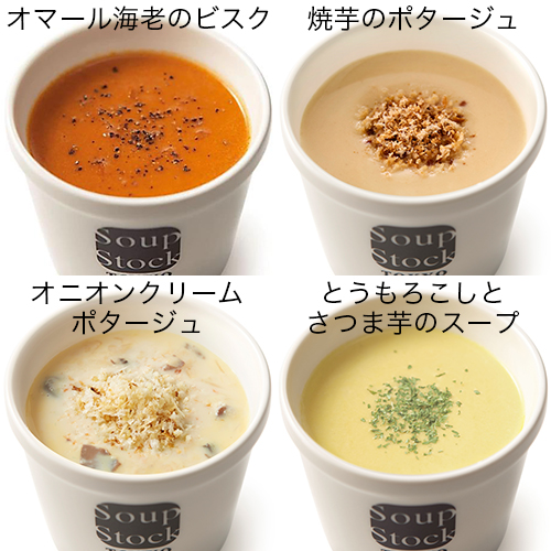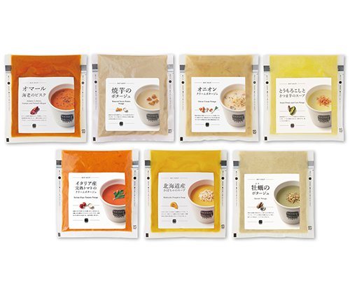 内容量:オマール海老のビスク、焼芋のポタージュ、オニオンクリームポタージュ、とうもろこしとさつま芋のスープ、イタリア産完熟トマトのクリームポタージュ、北海道産かぼちゃのスープ、牡蠣のポタージュ 各180g 計7種×各1パック