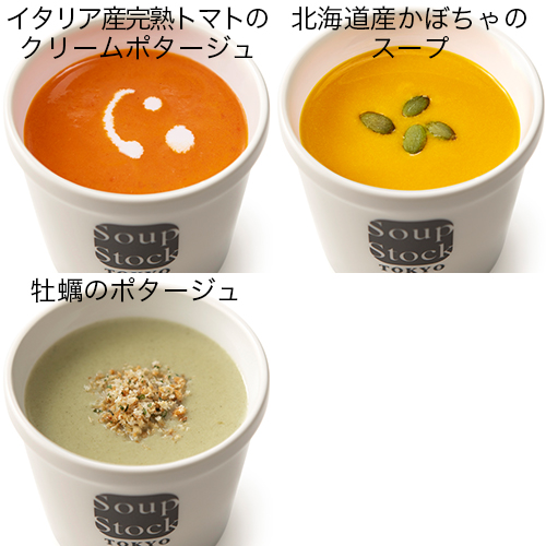 スープストックトーキョー定番の「オマール海老のビスク」をはじめ、玉葱やじゃがいもなどの野菜の甘みが凝縮した「オニオンクリームポタージュ」、濃厚な牡蠣の旨味を閉じ込めた「牡蠣のポタージュ」など季節限定のポタージュを存分にお楽しみいただけます。