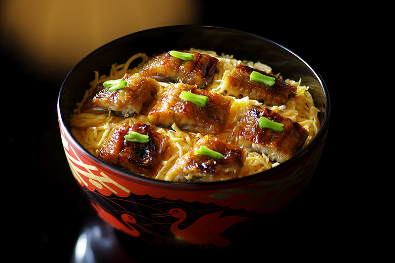 炊きあがりに鰻のたれを混ぜ合わせ、たっぷりの錦糸玉子、鰻蒲焼をのせた贅沢な鰻丼です