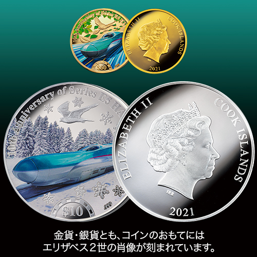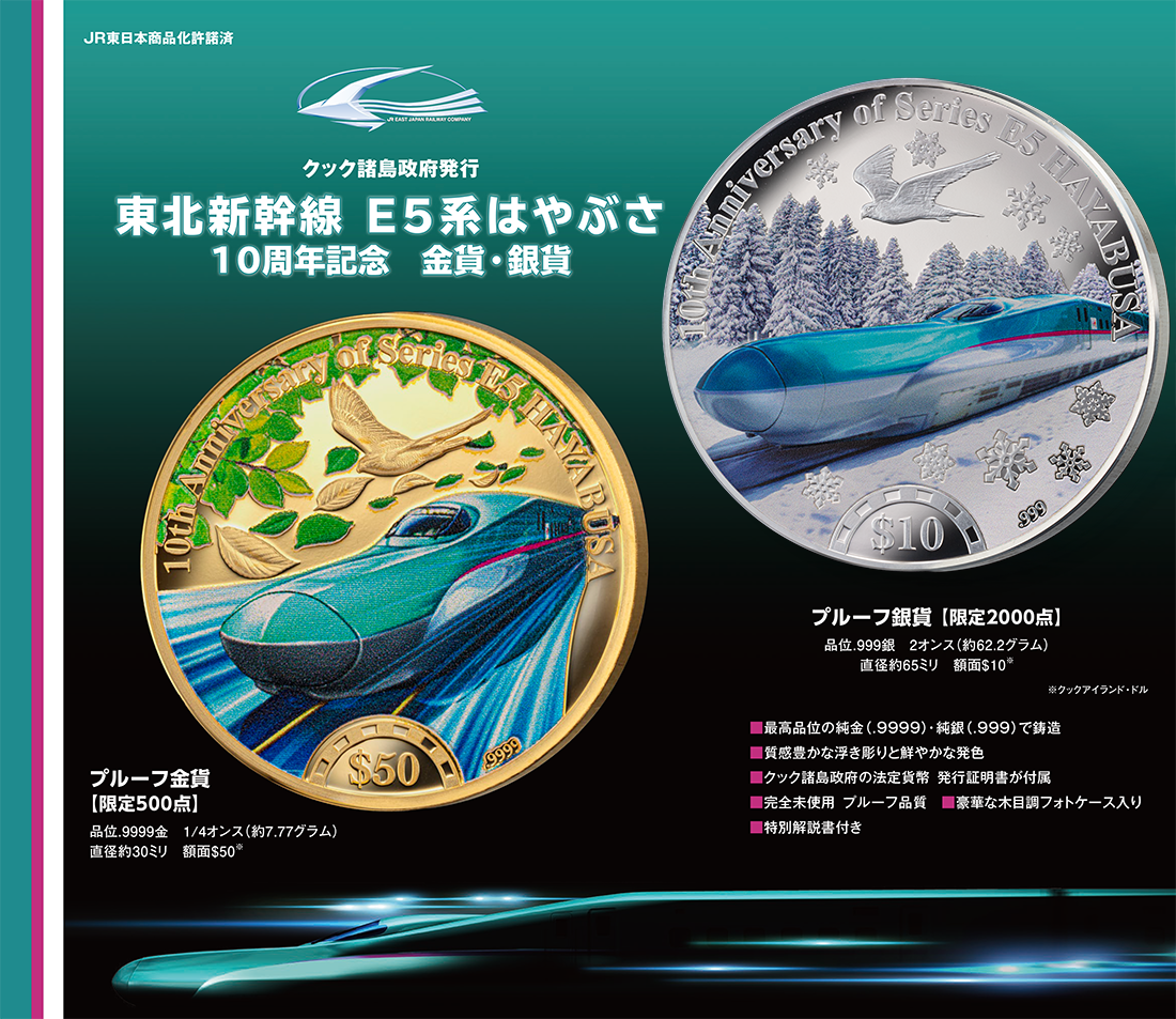 ロングノーズに“ときわグリーン”のインパクト---2011年の運行開始以来、時速320キロの圧倒的なスピードと安定の乗り心地で、世界にその名を轟かせてきた東北新幹線 E5系はやぶさ。デビュー10周年を迎え、美しい記念コインにその姿が刻まれました。クック諸島の法定貨幣として、限定数のみ発行された貴重なカラー金貨・銀貨のご案内です。