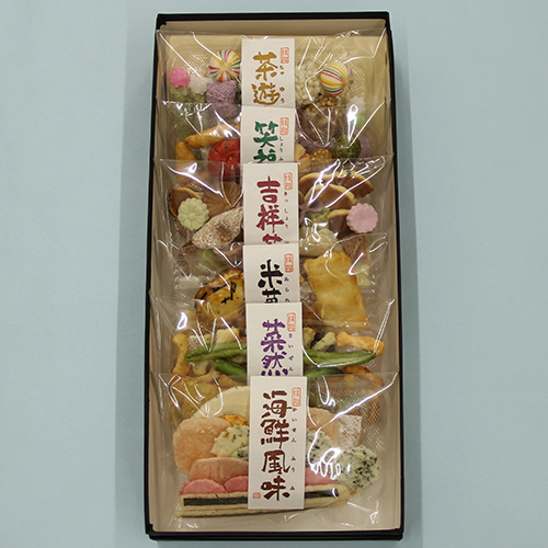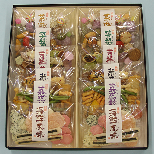 海老煎餅類、米菓、吹き寄せ、駄菓子、豆菓子、野菜とあられ、と6種類の個性が光る個袋菓子の詰合せです。