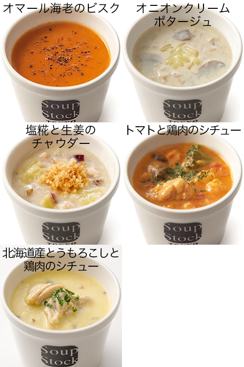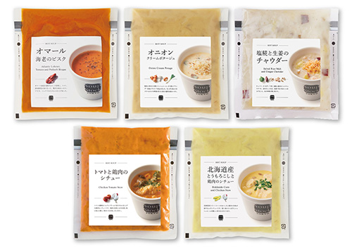 内容量:オマール海老のビスク・オニオンクリームポタージュ・塩糀と生姜のチャウダー・トマトと鶏肉のシチュー・北海道産とうもろこしと鶏肉のシチュー 各180g 計5種×各1パック