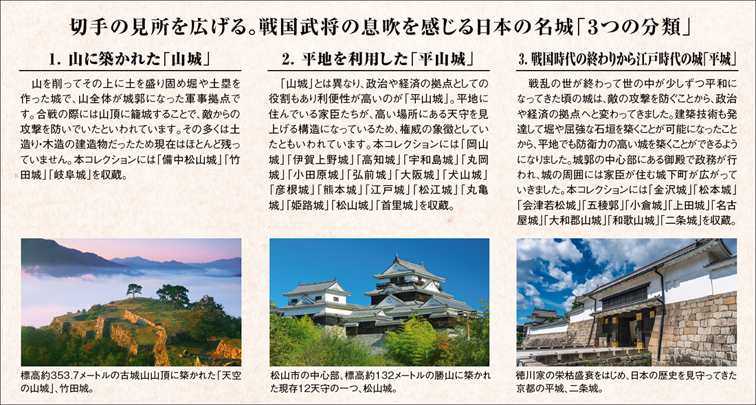 城ごとに、美しい写真があしらわれた特製解説カードにセットして