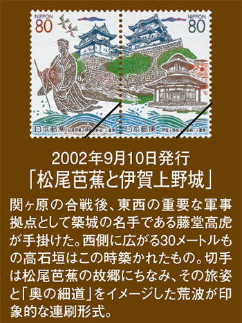 例えば「一ノ谷の戦い」「湊川の戦い」等の大戦の舞台にもなった兵庫県、日本初の世界遺産の美城「姫路城」。南北朝時代の武将・赤松貞範に始まり、羽柴秀吉をはじめさまざまな武将や大名を城主とした名城の、白鷺を想わせる白漆喰総塗籠造りの城壁や大天守閣、曲輪や堀、石垣を俯瞰より臨んだ城図の切手ほか計5枚が、雲一つない快晴に映える連立式天守も見事な写真を背景に集合。また「現存12天守」の中でも最古の建築物として国宝に指定されている「犬山城」は、信長・秀吉・家康が手にし「天下人が奪い合った城」とされる望楼型の平山城。この切手は写真家・麻賀進氏撮影の写真をもとにした1987年発行の「第3次国宝シリーズ」、平塚毅氏が撮影した写真を原画として発行された「日本の城シリーズ」第2集より厳選されました。
