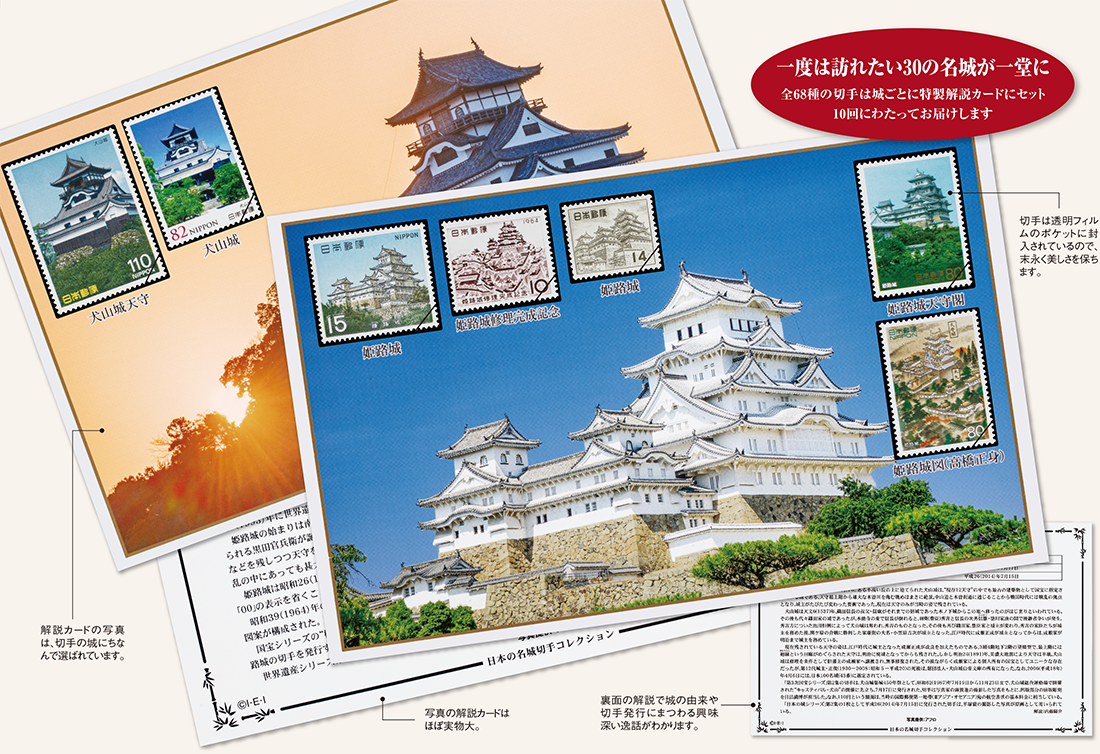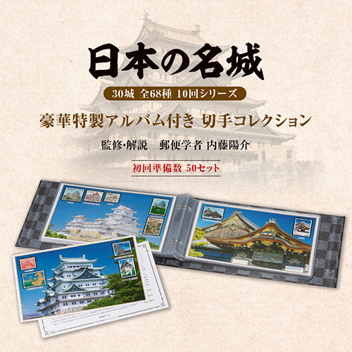 <日本の名城>切手コレクションはすべて未使用・極美品。切手は、城ごとに写真入りの特製解説カードにセットして、毎月カード3点(3城)ずつ、10回にわたってお届けします。初回お届け時にバインダー式の専用アルバムが無料進呈されますので、お好きなようにファイルし、収集の愉しみをご堪能いただけることでしょう。過ぎ行く時代とともに消え去ってしまう前に、ぜひとも手に入れておきたい「切手という名の歴史遺産」──。確保できる切手の数に限りがございますので、今回のご提供数は10セットのみとさせていただきます。確実に入手なさるためにも、ぜひ今すぐお申し込みください。