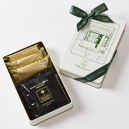 内容量:Bicerinコーヒーサンド×3個、Bicerinオリジナルブレンド(沖縄珈琲配合)ドリップパック×3個