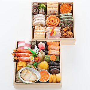 山海の恵みを贅沢に盛り込んだ、見た目も美しい和洋二段重のおせちです。