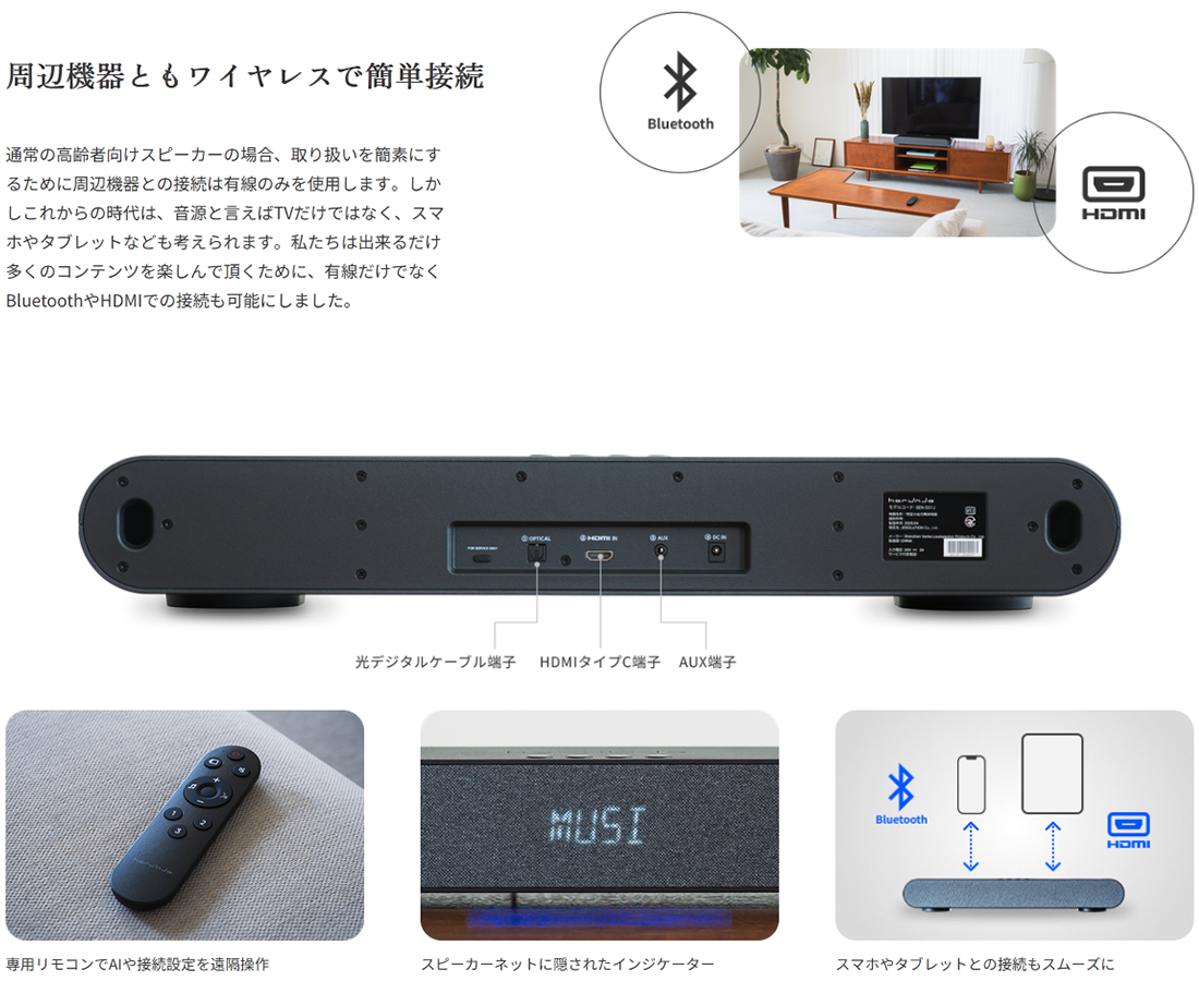 子音と母音それぞれの発音特性に着目し、音量を別々にコントロールする独自アルゴリズムをAIで開発しました。これにより、音量を必要以上に上げなくても、声の輪郭がよりクリアに。さらに、“ヒアリング・エイドモード”を搭載。小さすぎて聞こえにくい音を持ち上げ、大きすぎて耳障りな音を和らげることで、常に快適な「聞き取りやすい音量ゾーン」に音を集約します。もちろん、一般的なサウンドバーとしても高音質。ニュースや映画、ドラマはもちろん、音楽番組やライブ配信も5つの聴音モードから、お好みの音色でお楽しみ頂けます。