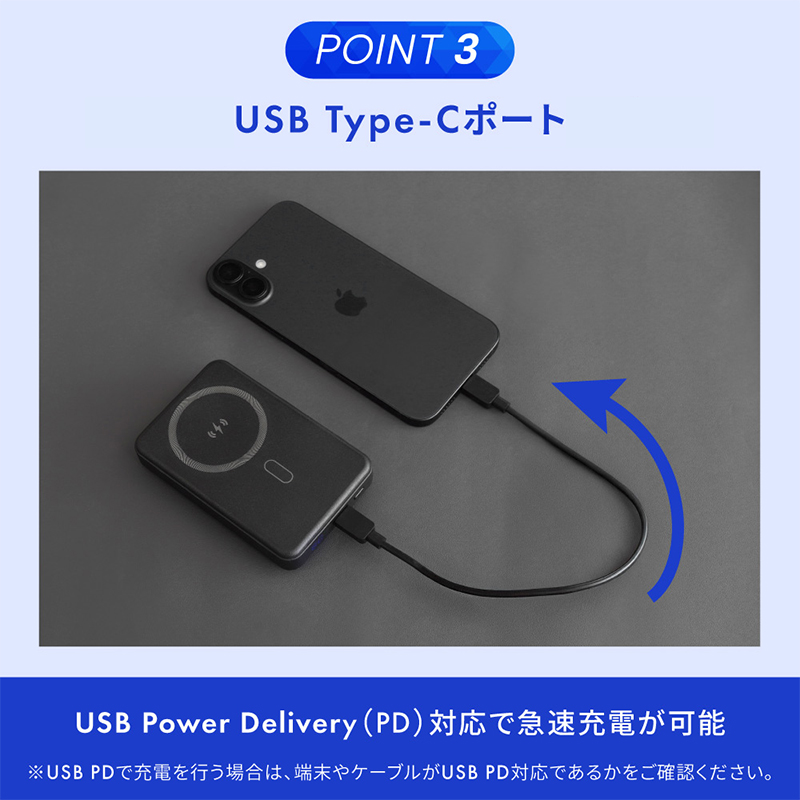 ※5,000mAhは一般的なスマートフォンを約1回フル充電できる容量です。スマートフォンのバッテリー容量や使用状況によって充電回数は前後します。