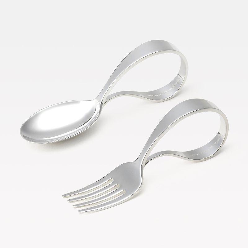 お子様の小さな手でもしっかりと握りやすい持ち手のカーブに工夫を凝らしたベビースプーンとベビーフォークのセット。