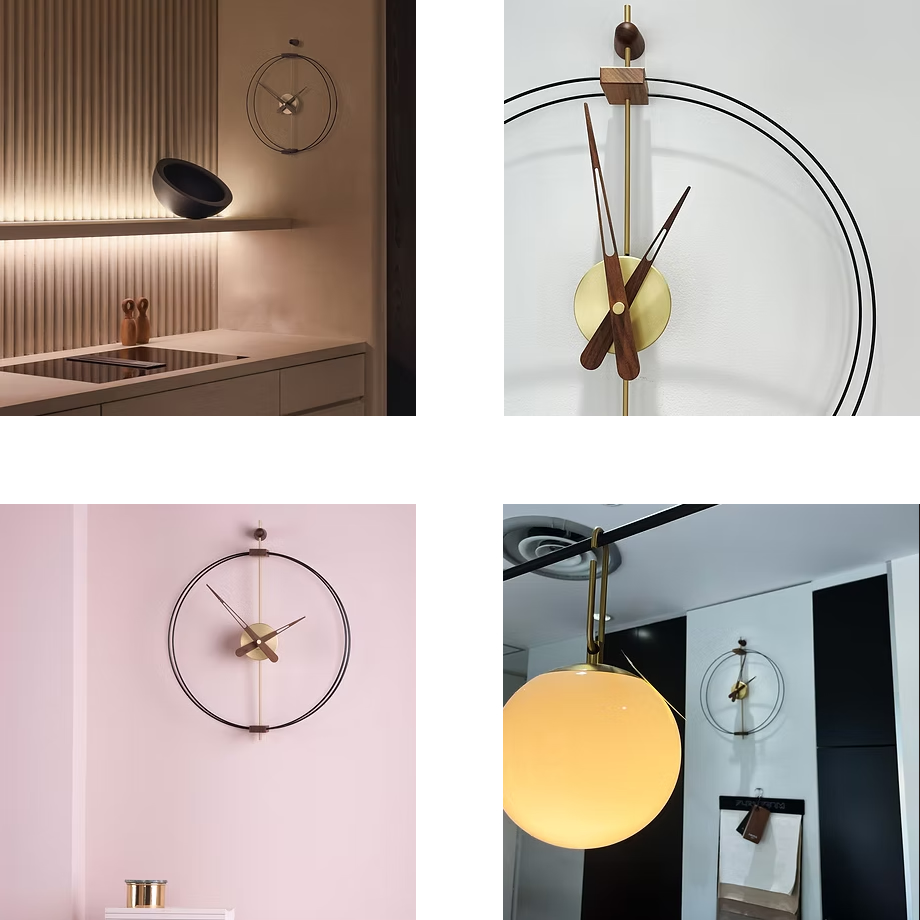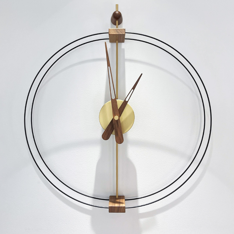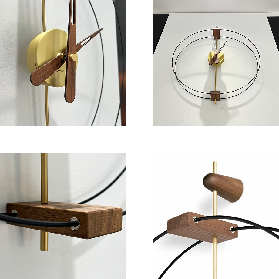 スペイン・バルセロナを拠点とするnomon(ノモン)の室内時計。時計ケースと針を囲むリングが細いダブルラインとなっており、ウォールナットのポイントが粋に効いています。