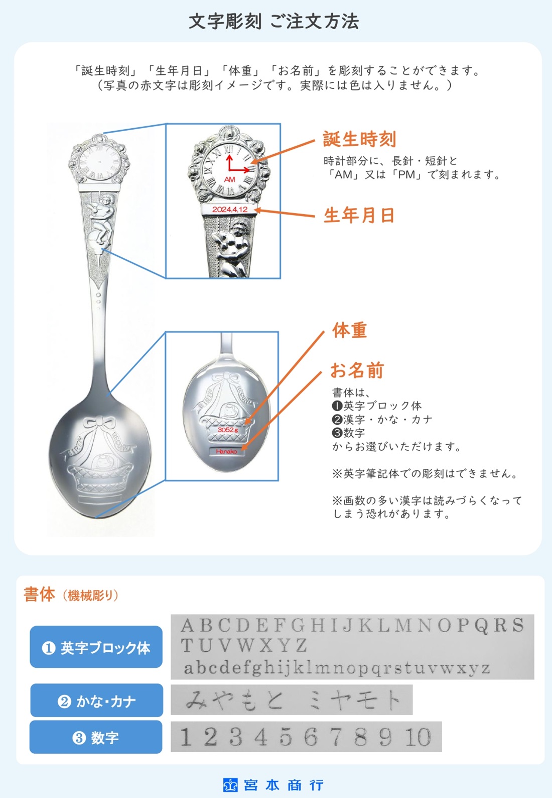 お名前、生年月日・時間、お誕生時の体重を刻印できる記念のスプーン。