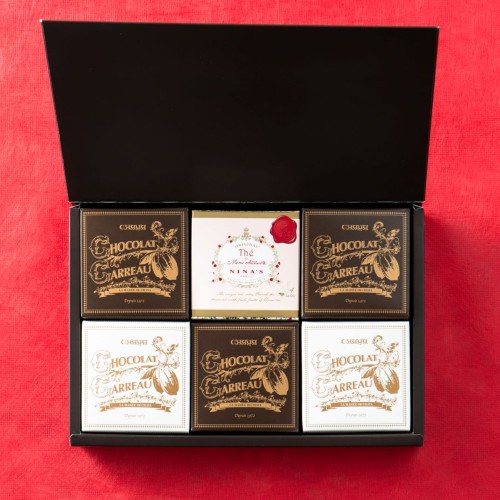 ヨーロッパの街並ある板瓦のような、かわいい四角いガトーショコラ2種と「NINA’S オリジナル マリー・アントワネットティー」の期間限定アソートです。