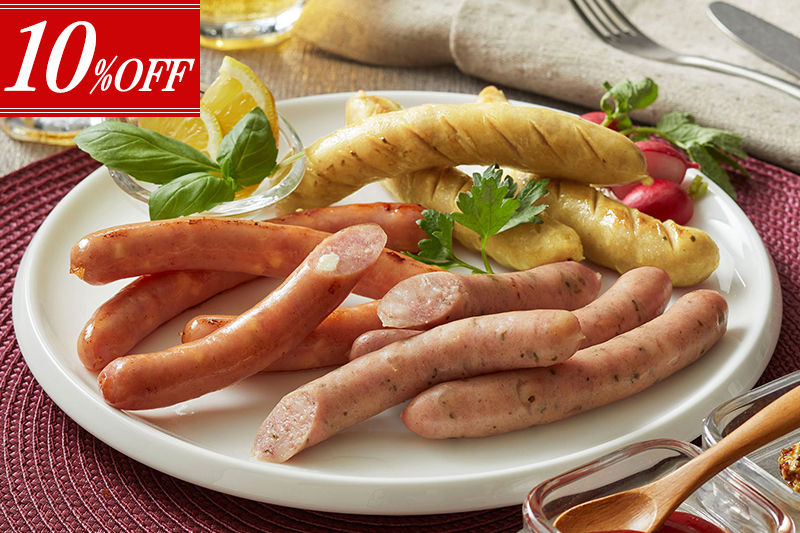 レモンバジルのあっさりとした味わいのウインナー、スパイシーなカレー、コクのあるプロセスチーズ入りウインナー3種類セット。