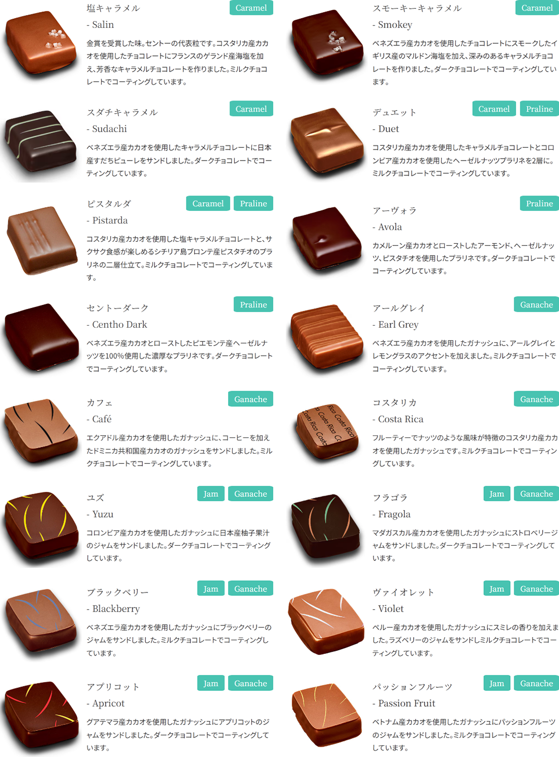 Centho(セントー)の特徴はなんと言ってもカカオへのこだわり。カカオの原産地にこだわり、カカオの個性にあわせたフィリングを選定し、ベストマッチ・チョコレート創りを追求しています。