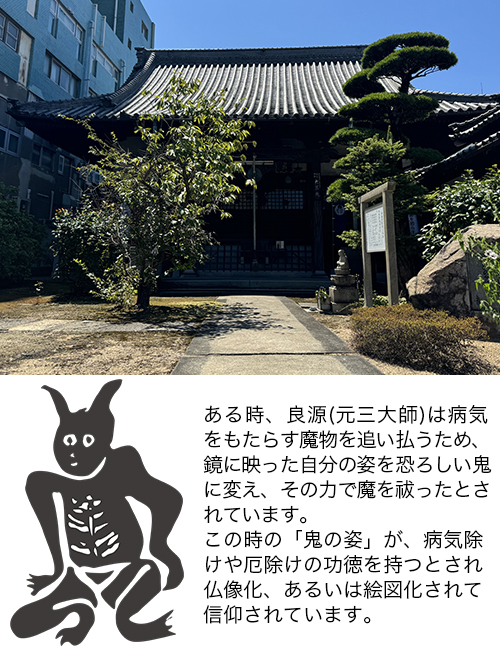 香川県丸亀市の古刹、正因山実相院妙法寺(しょういんざんじっそういんみょうほうじ)に伝わる「元三大師降魔尊像(がんざんだいしごうまそんぞう)」(丸亀市指定文化財)は、比叡山延暦寺中興の祖とされる元三大師こと良源(りょうげん)が悪鬼を祓った時の姿=鬼大師を表したものです。