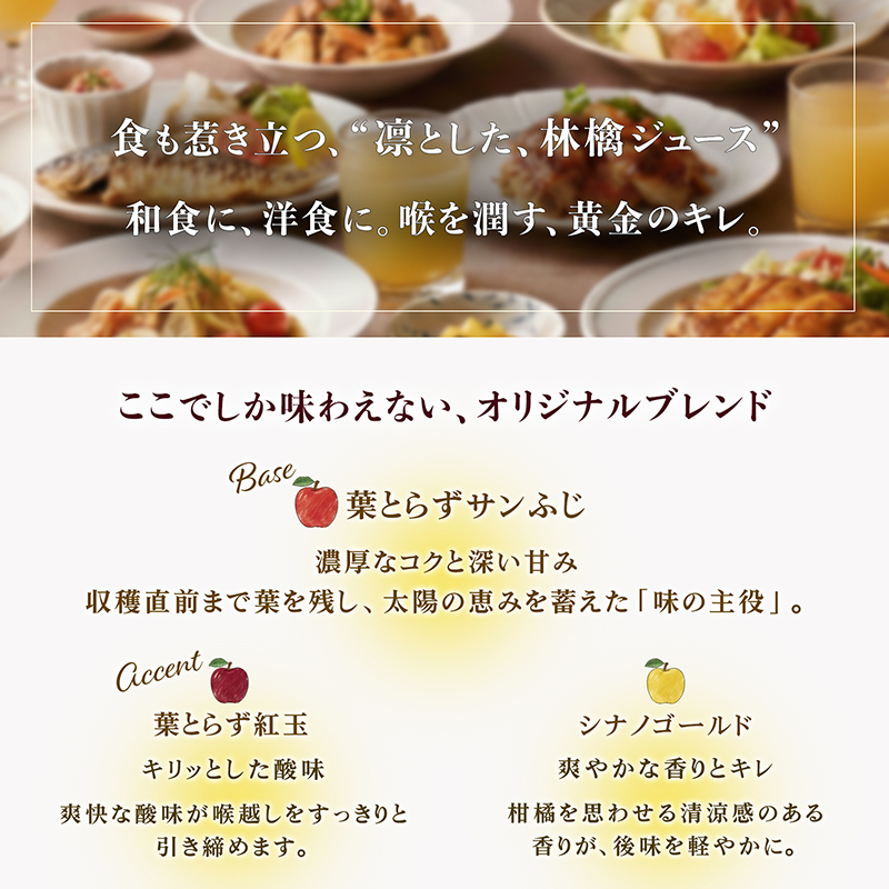 豊かな甘みとコクのベースとなる「葉とらずサンふじ(70%)」に、キリッとした酸味が味を引き締める「葉とらず紅玉(20%)」、そして芳醇な香りと爽やかさをプラスする「シナノゴールド(10%)」を絶妙なバランスで掛け合わせました。砂糖や香料は一切使用しておらず、果実そのものの立体的で奥深い味わいをお楽しみいただけます。