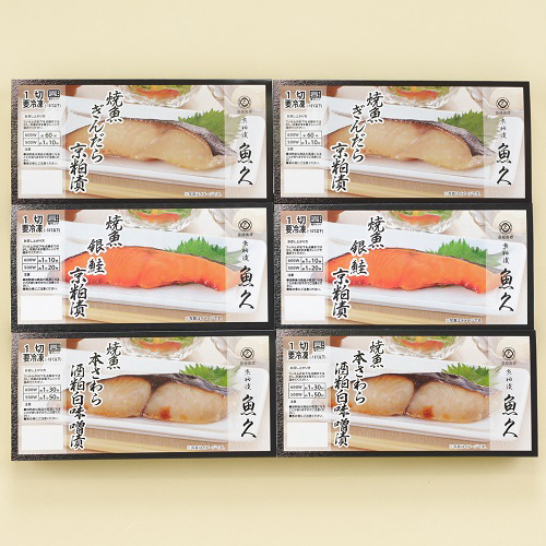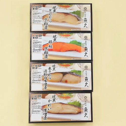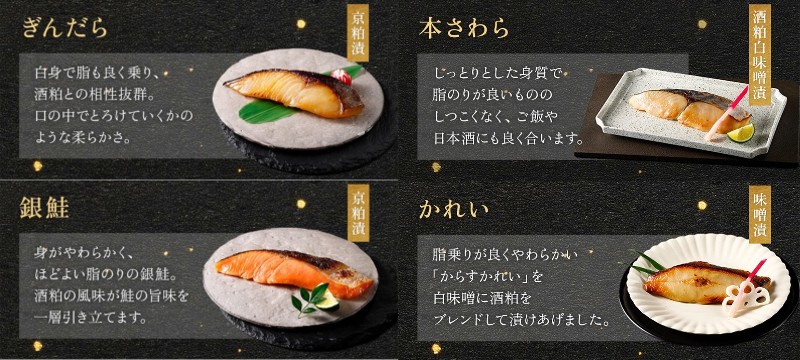 内容量:ぎんだら粕漬け焼き 55g×1、銀鮭粕漬け焼き 55g×1、本さわら酒粕白味噌漬け焼き 55g×1、かれい味噌漬け焼き 50g×1