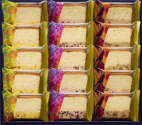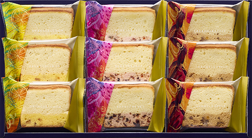 砂糖(国内製造)、マーガリン、小麦粉、オレンジピール砂糖漬、ナチュラルチーズ、液卵、卵白加工品(卵白、食塩)、加糖卵黄、転化糖、プロセスチーズ、牛乳、ショートニング、洋酒、濃縮レモン果汁、卵たんぱく、食塩/加工デンプン、乳化剤、香料、着色料(カロテノイド)、(一部に小麦・卵・乳成分・オレンジ・大豆を含む)