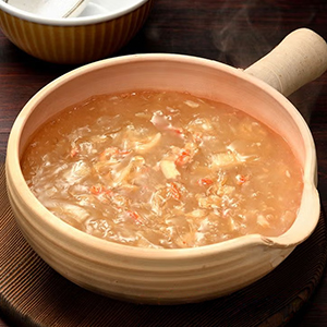 原材料:ガラスープ(鶏豚エキス、豚鶏ガラスープ、その他)(国内製造)、ふかひれ、鶏油、醤油、オイスターソース、ポークエキス調味料、生姜汁、食塩、砂糖、全粉乳、かきエキス調味料/増粘剤(加工澱粉、キサンタンガム)、調味料(アミノ酸等)、カラメル色素、酸味料、(一部に豚肉・鶏肉・牛肉・大豆・小麦・乳成分・魚醤(魚介類)を含む)