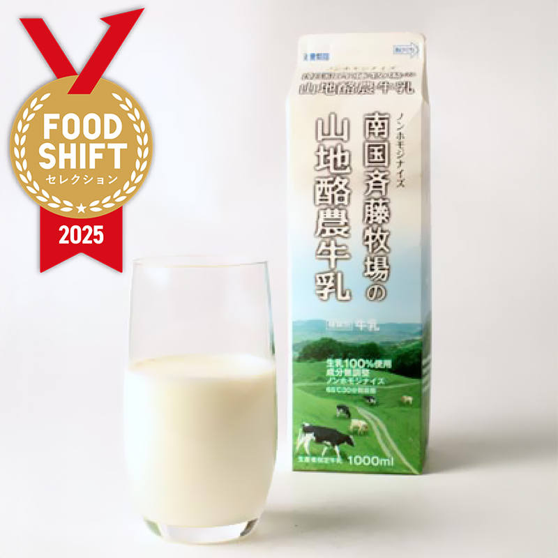 斉藤牧場では山に日本芝を植え、それを主食にした牛は自由に山を歩き、ストレスもなく、健康です。そのこだわりの牛乳を、低温殺菌、ノンホモジナイズ(脂肪球を壊さない)でパックしました。生クリームが浮かび、甘いコクとさっぱりとした後味は、二次加工者の方々にもご好評いただいております。お料理や、スイーツにも、ぜひご利用ください。
