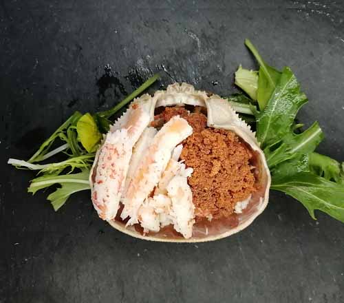 京都府京丹後・間人(たいざ)産のセイコ蟹を甲羅盛りに仕上げました。 甲羅に蟹身と蟹味噌を詰めた逸品です。