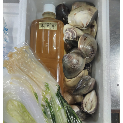 原材料:蛤、だし汁(鰹節、料理酒、味醂、醤油)、白菜、えのきだけ、水菜、しらたき
