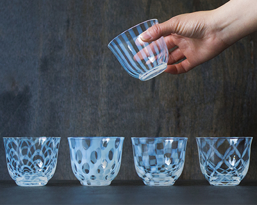骨灰という特殊な原料の入った硝子を使い、急激な温度差を与え、乳白色(オパール色)に発色させることで、文様を浮かびあがらせます。