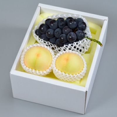 桃とニューピオーネの詰め合わせです。とろけるような食感の桃と濃厚な甘みと酸味のニューピオーネ、岡山の代表的な果物の詰め合わせをお楽しみください。
