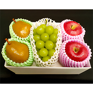 なめらかな食感のラ・フランス、人気のある品種のサンふじ、甘みと酸味のバランスの良いシャインマスカットのセットです。