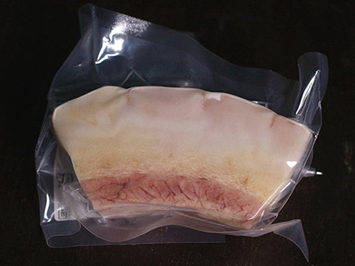 ヒゲ鯨類の畝須(うねす)を水煮して作りました。長崎ではお正月やおめでたい席でベーコンと一緒に頂きます。ベーコンとは異なり、塩蔵せずに、水煮しているので脂肪分が抜け食べやすく、さっぱりとした味と食感です。