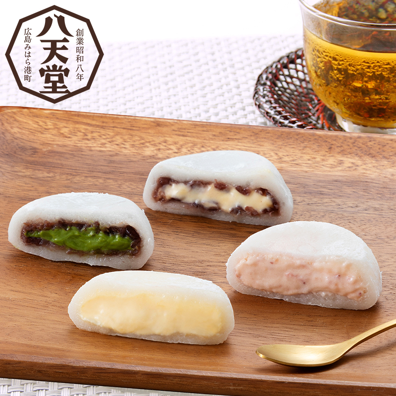とろける求肥に北海道つぶあんと八天堂の特製カスタードクリームを包み込みました。つぶあんの優しい甘さとカスタードクリームの相性も抜群です。