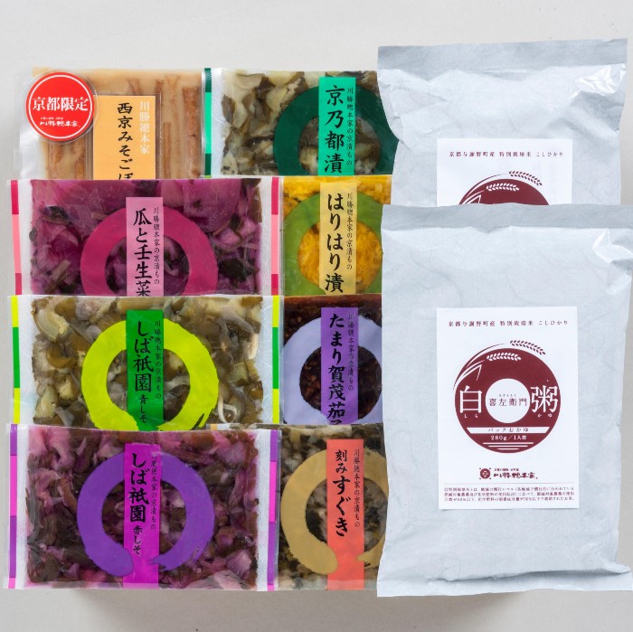 内容量:喜左衛門白粥280g×2、西京みそごぼう50g、しば祇園赤しそ40g、しば祇園青しそ40g、刻みすぐき40g、京乃都漬40g、瓜と壬生菜の茜漬40g、たまり賀茂茄子40g、はりはり漬40g