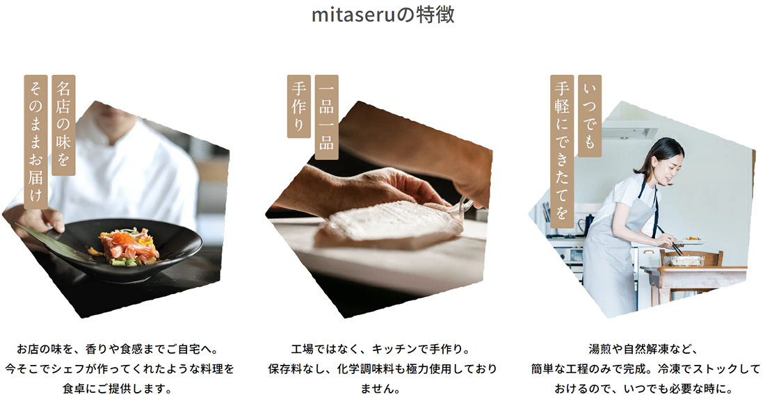 mitaseru(ミタセル)はいつでもほんのひと手間で、名店の味が食卓を満たせる厳選お取り寄せグルメです。料理人のこだわりをもっと多くのご家庭へ。冷凍だからこそできる手作りをお取り寄せいただけます。働く、住む、遊ぶ。暮らしをもっと満たせるために、食からできることを考えました。おいしいが、毎日を満たせるように。三井不動産グループが考える暮らしへの新しいグルメ通販サービスを、ぜひお楽しみください。