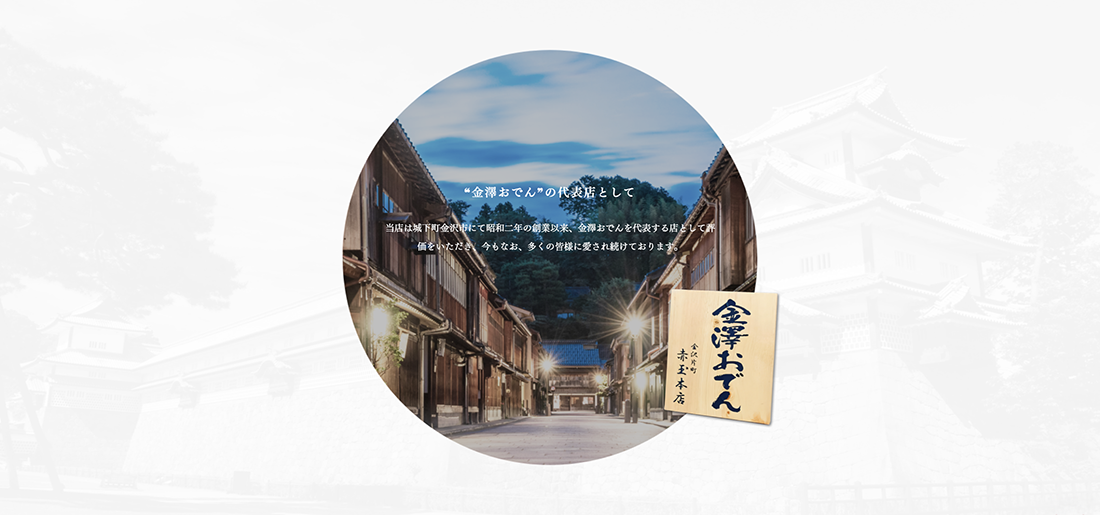 当店は城下町金沢市にて昭和二年の創業以来、金澤おでんを代表する店として評価をいただき、今もなお、多くの皆様に愛され続けております。