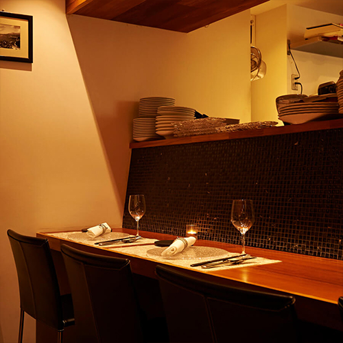 お向かい合わせよりもカジュアルな雰囲気で、又は、並んでおかけになることにより一層のお近しさを感じてリラックスいただけるように、低めで広めの、お食事用のカウンター席もご用意しております。