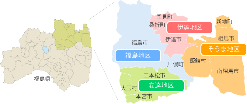 JAふくしま未来は福島県北地域(福島市・伊達市・二本松市・本宮市・川俣町・国見町・桑折町・大玉村)と相馬地域(相馬市・南相馬市・新地町・飯舘村)の12市町村を管轄する広域JAで、管内面積は福島県全体の19%を占めています。